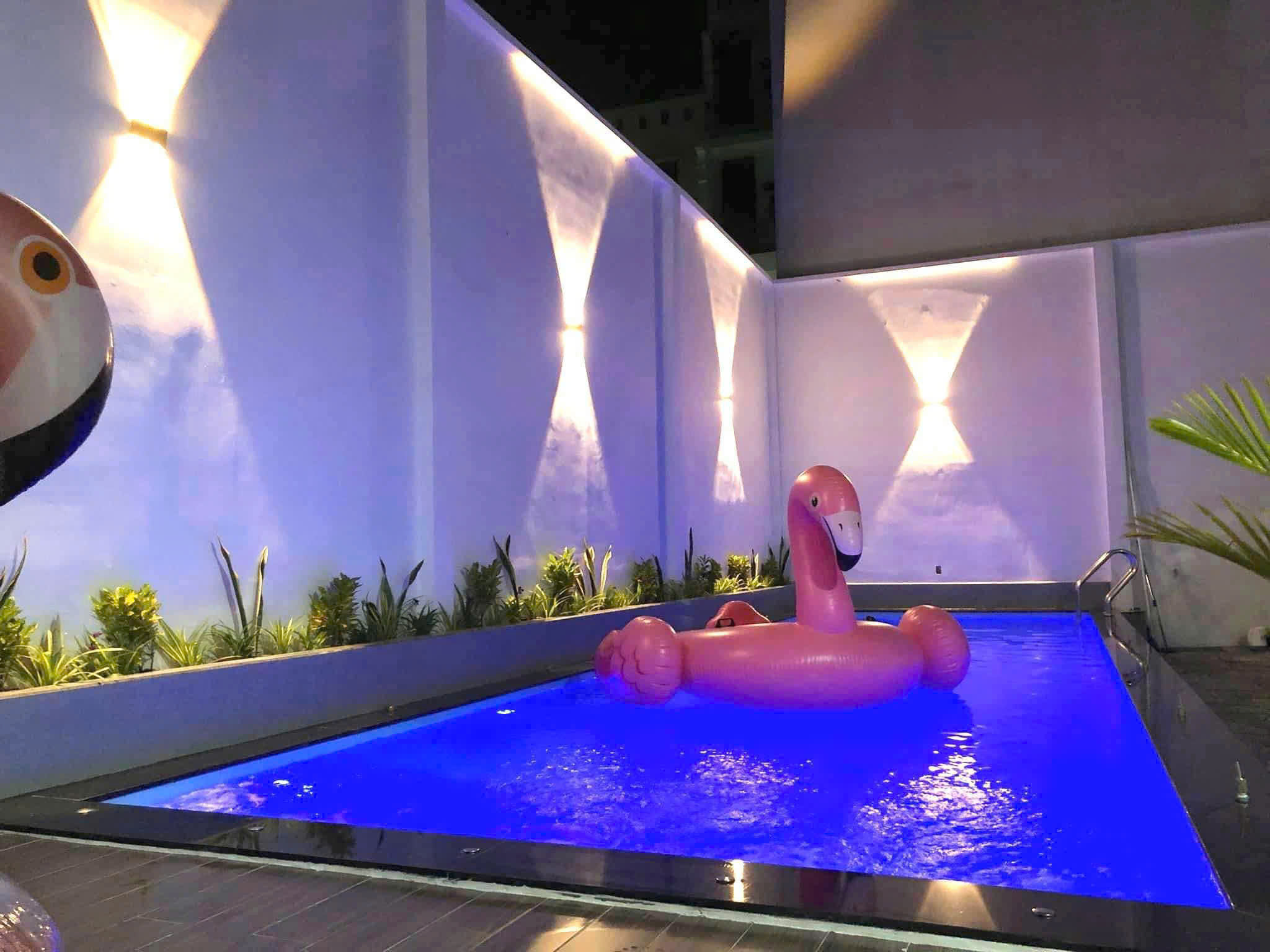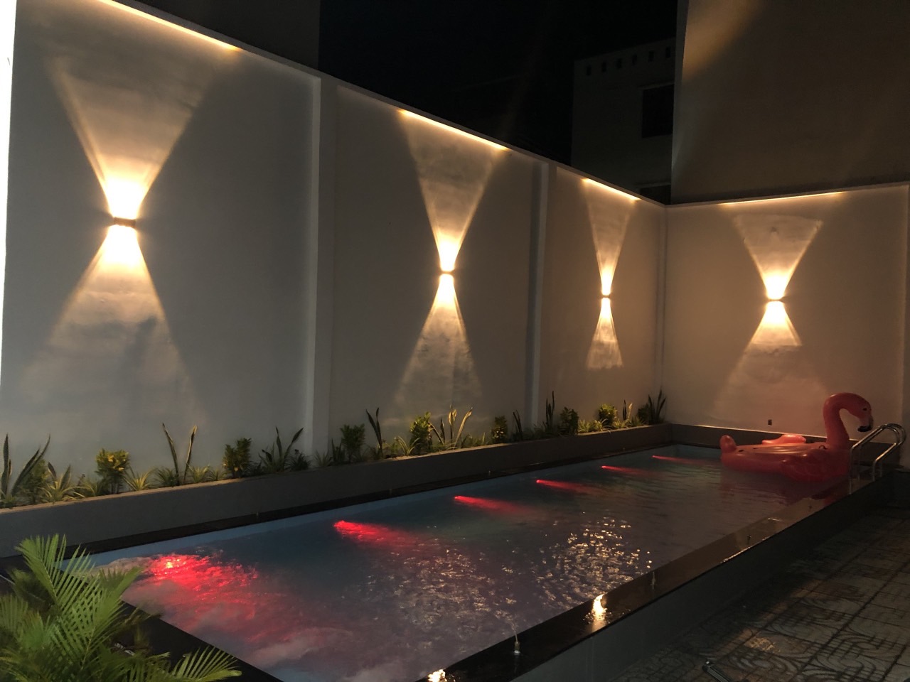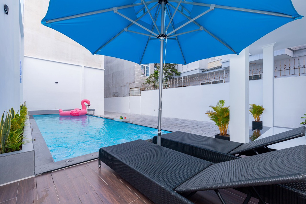1 hồ bơi rộng 45m2 ngoài trời, có bàn ghế BBQ ngoài trời bên cạnh hồ bơi