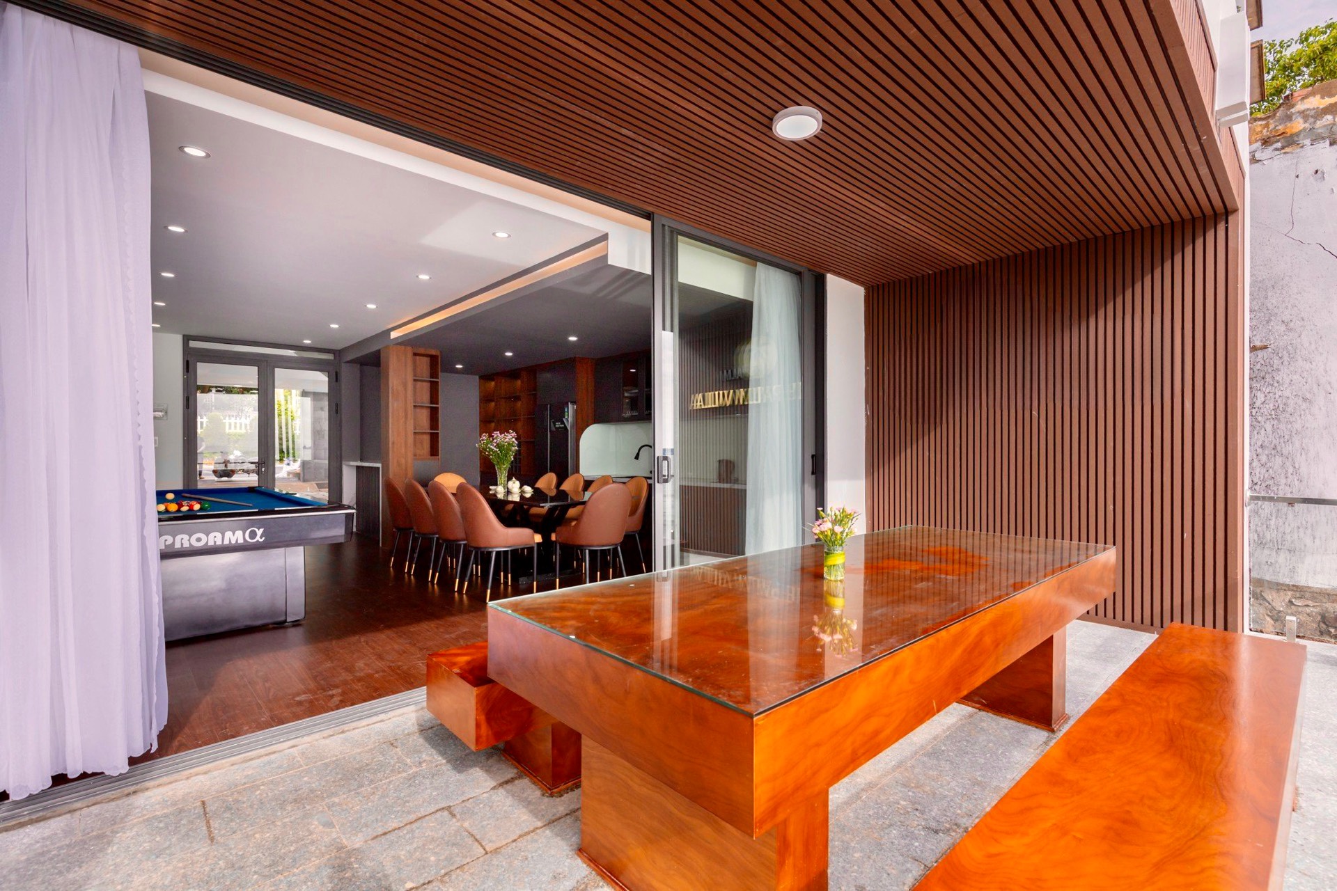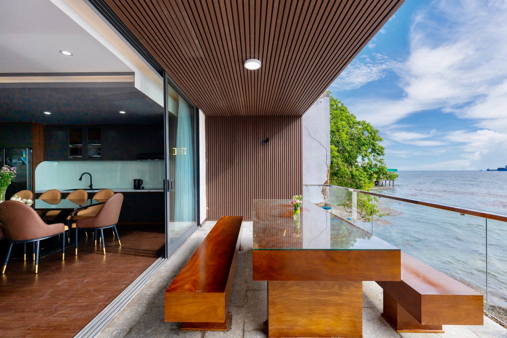 BBQ ở ban công tầng trệt, nối với không gian phòng khách, có sẵn bàn ghế và bếp nướng BBQ