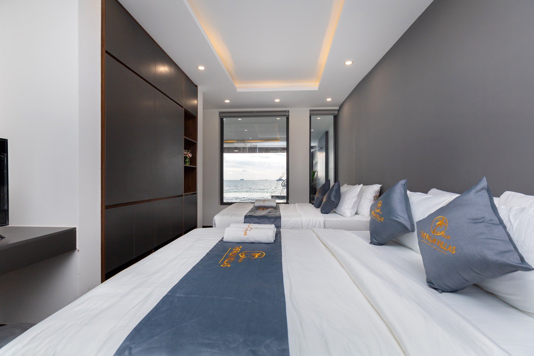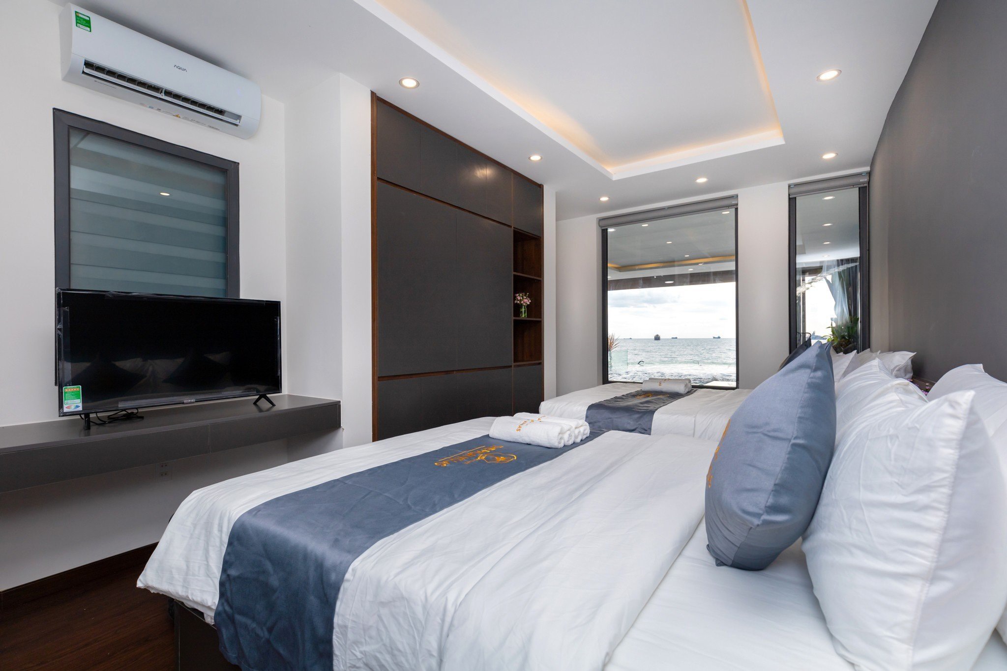 Villa 6 phòng ngủ – 8 giường – 7wc + nệm thêm (tầng trệt có 2 phòng ngủ, tầng 1 có 4 phòng ngủ – phòng master có view biển và bồn tắm xịn xò, chụp hình sống ảo thì lung linh)